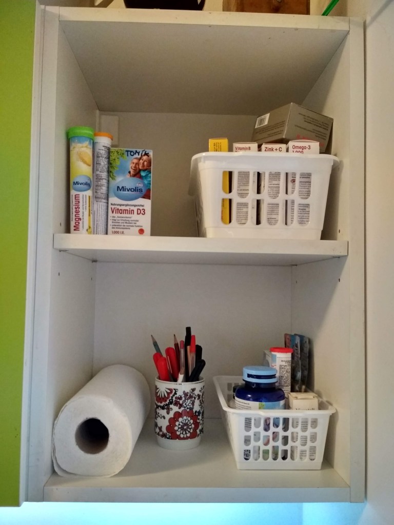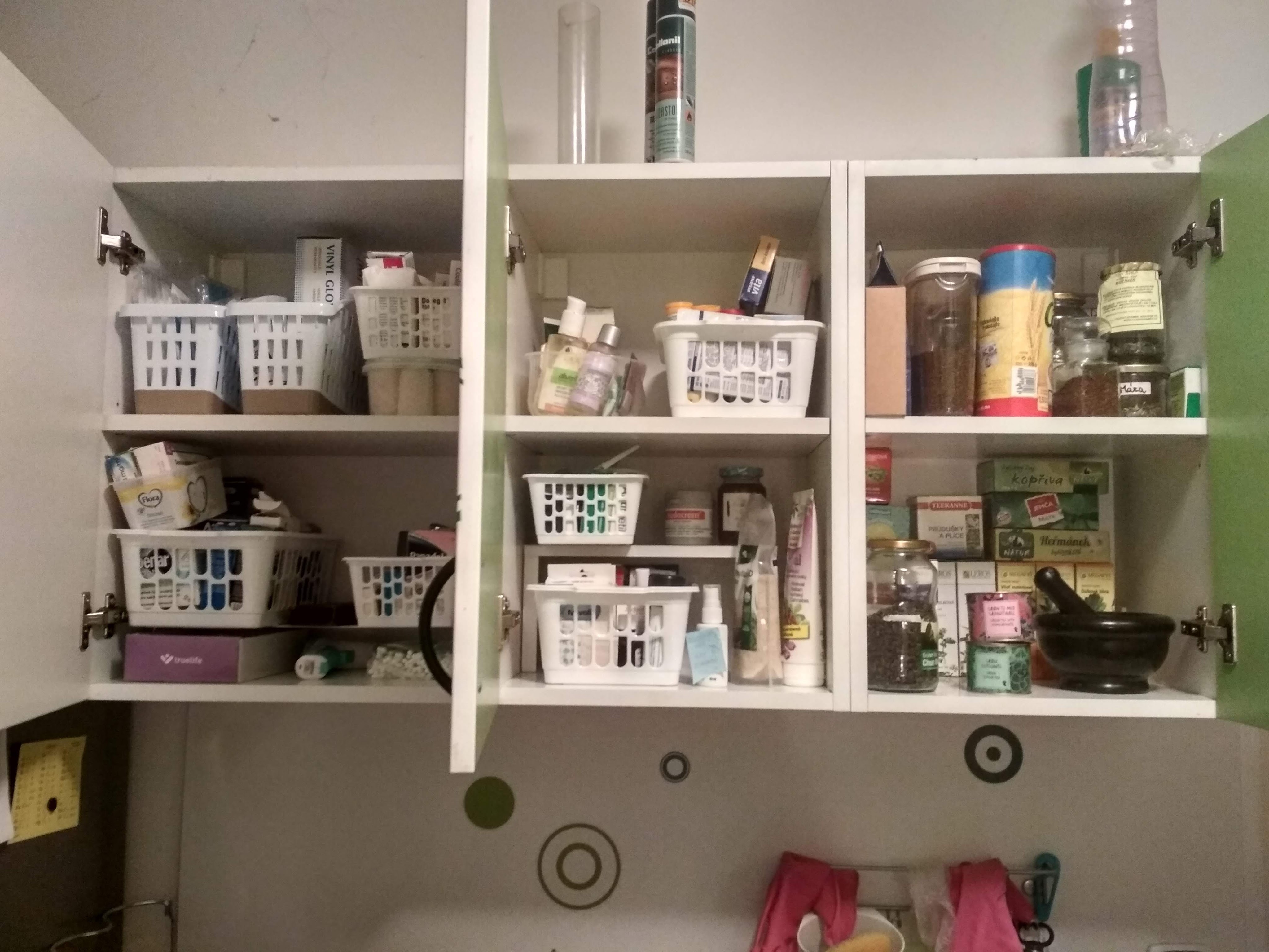 Po: Léky, vitamíny, náplasti a další věci byly rozděleny do skupin a dány do košíčků. Lékárnička se rozšířila o jednu skříňku. Bylinky, Melta, Caro a hmoždíř zůstaly v pravé části. Čaje a káva se přesunuly na druhou stranu kuchyně k hrnečkům.